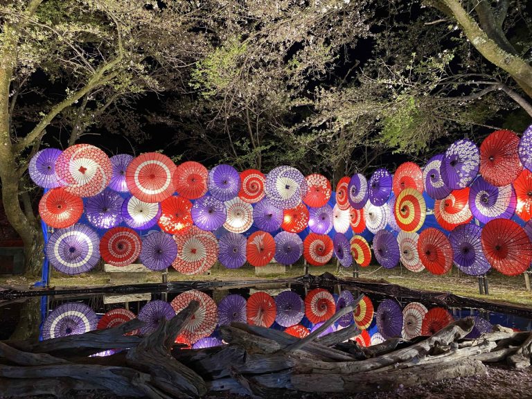石段を登ると、和傘を用いたイルミネーション。